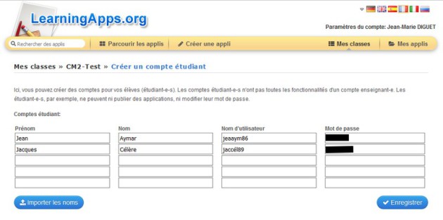 en important une liste d'élèves par le bouton Importer les noms :