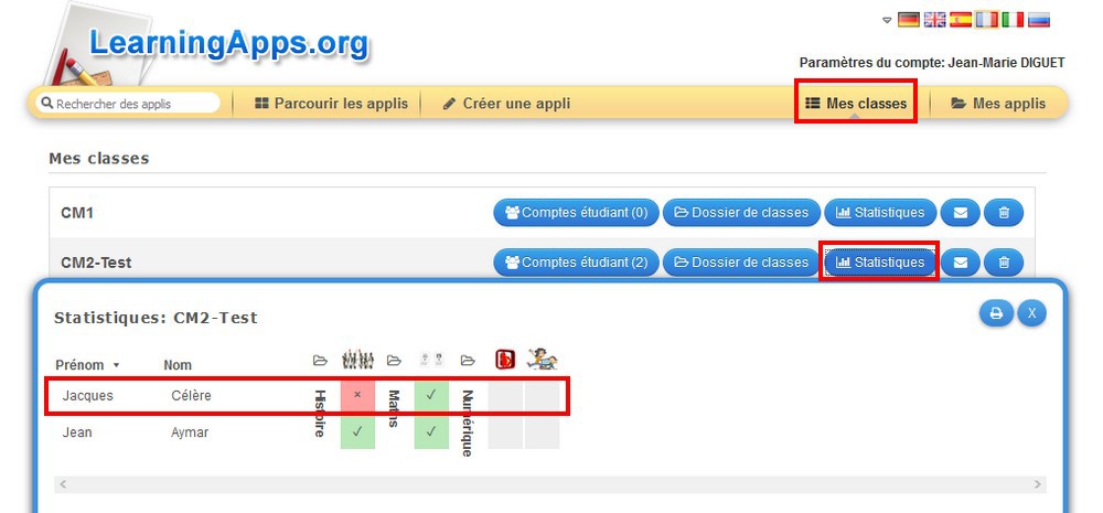 vous cliquez sur le bouton Statistiques de la classe voulue.