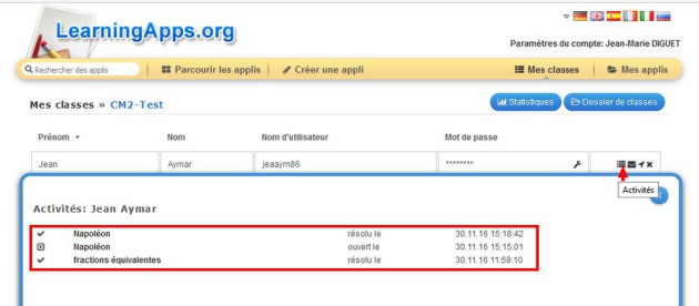 Vous accédez alors à la liste de tous vos élèves et vous pouvez consulter les résultats de chaque élève en cliquant sur le bouton Activités[4] de chaque élève.