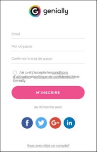 Vous allez sur le site de Genially (https://www.genial.ly/) et vous cliquer sur Inscription ou Créer un compte pour accéder à la création du compte. Vous avez deux possibilités pour créer un compte :