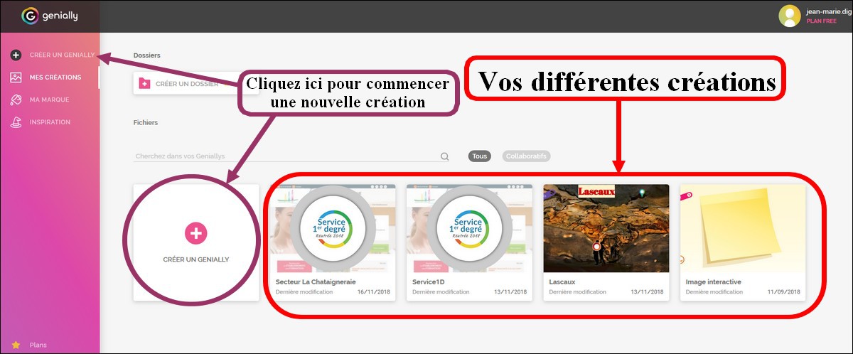 Une fois inscrit, vous vous connectez et vous arrivez sur votre espace personnel qui doit comporter uniquement le bouton "Créer un Génially". C'est là que vous trouverez ensuite vos créations.