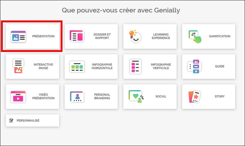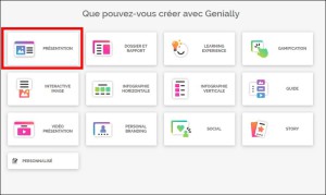 Vous cliquez sur "Créer un Genially" et vous arrivez sur une page où vous trouvez les différentes possibilités de création classées par type. Choisissons par exemple Présentation. |