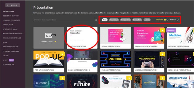 L'écran qui s'affiche alors vous propose plusieurs modèles dont certains sont déjà interactifs. Vous pouvez sélectionner des groupes de modèles avec les boutons Tous, Nouveaux, Corporatifs, Education, Autres mais aussi Gratuits ou Premium.