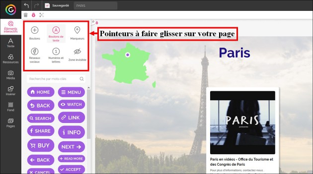 soit vous cliquez sur le bouton Interactivité du menu vertical et vous ajoutez alors un pointeur : boutons, boutons de texte, marqueurs, réseaux sociaux, numéros et lettres, zone invisible (image Interactivité1 ci-dessous)