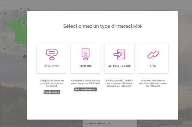 L'interactivité peut être ajoutée au fur et à mesure de la création (en sélectionnant les éléments à rendre interactifs) ou à tout autre moment. Pour ajouter de l'interactivité, 2 possibilités :