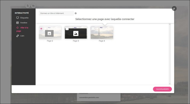 Pour mon exemple, j'ai sélectionné la carte de France, cliqué sur l'icône Interactivité et choisi Aller à la page. Dans la fenêtre qui s'affiche, je sélectionne la page voulue (ici la page 2) puis je clique sur sauvegarder.