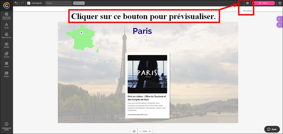Au fur et à mesure que vous rendez des éléments interactifs ou à la fin de votre création, vous pouvez vérifier le rendu réel en cliquant sur le bouton Prévisualiser dans la barre en haut à droite.