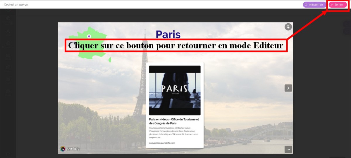 En mode Prévisualisation, vous pouvez tester les différentes interactivités paramétrées. Pour en sortir, il suffit de cliquer sur le bouton Editer.